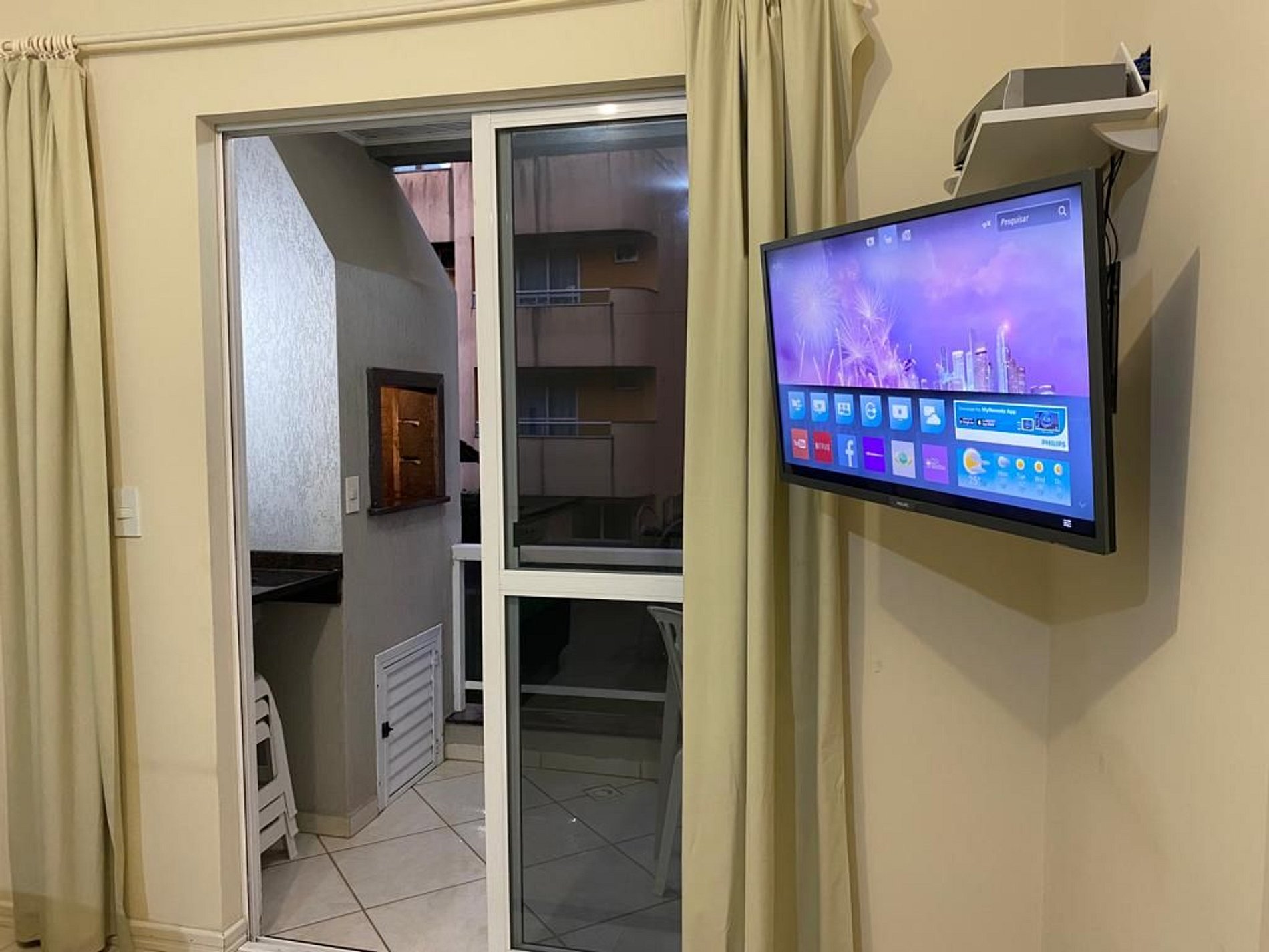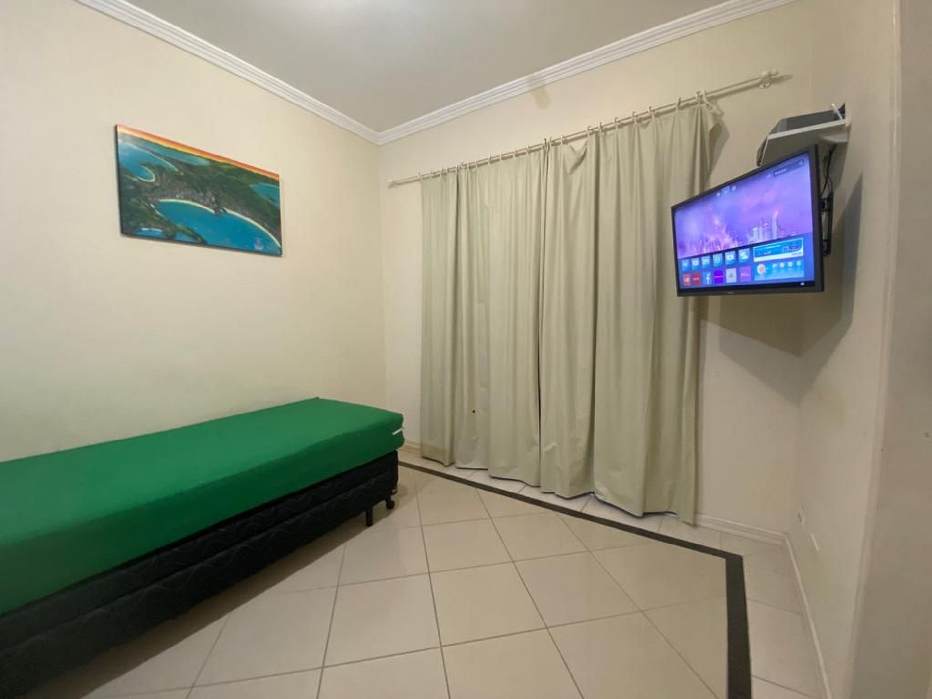 - Sala de estar com TV + 01 cama box de solteiro + cama auxiliar;
