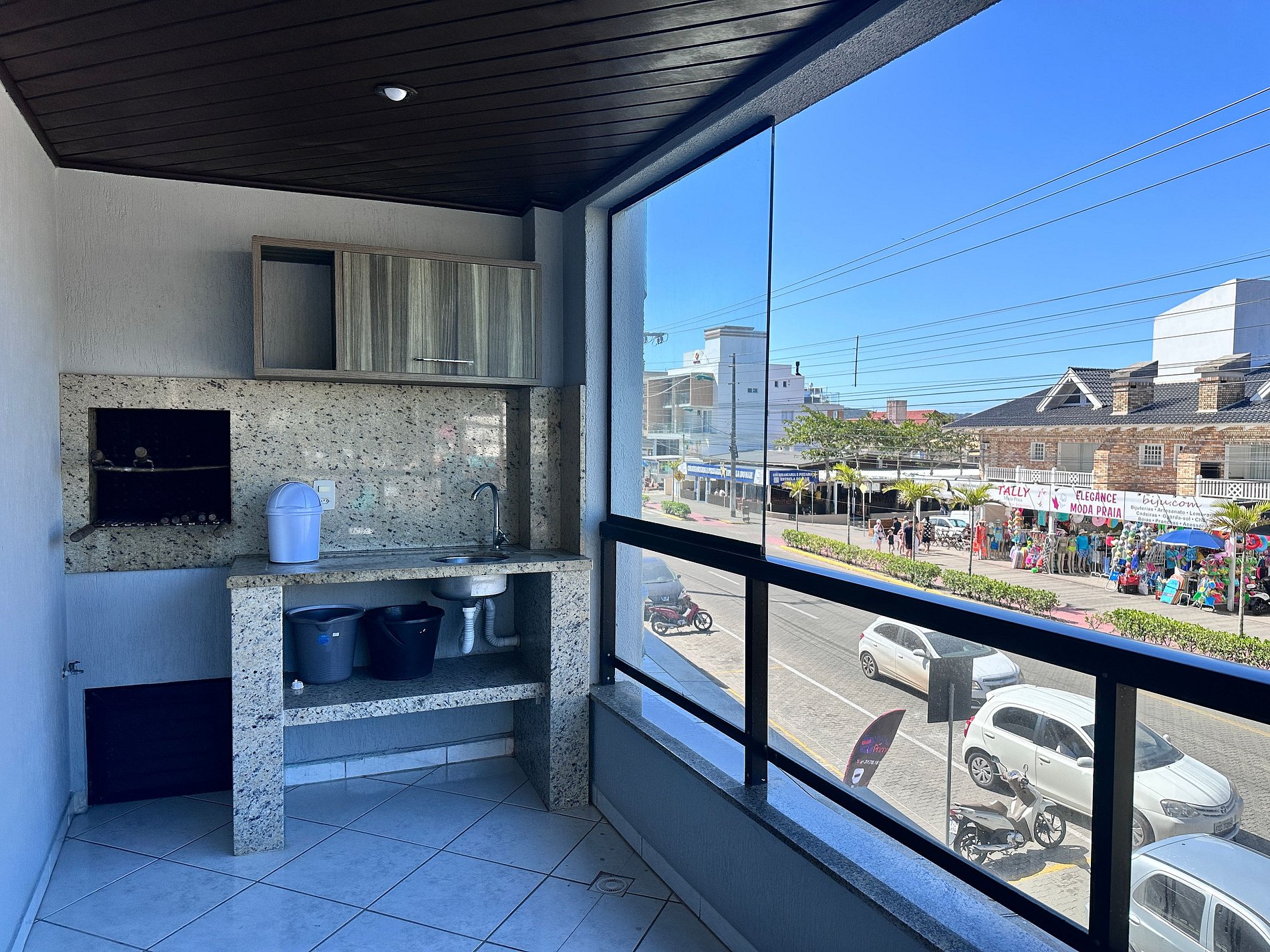 Sacada com Churrasqueira e vista do mar;