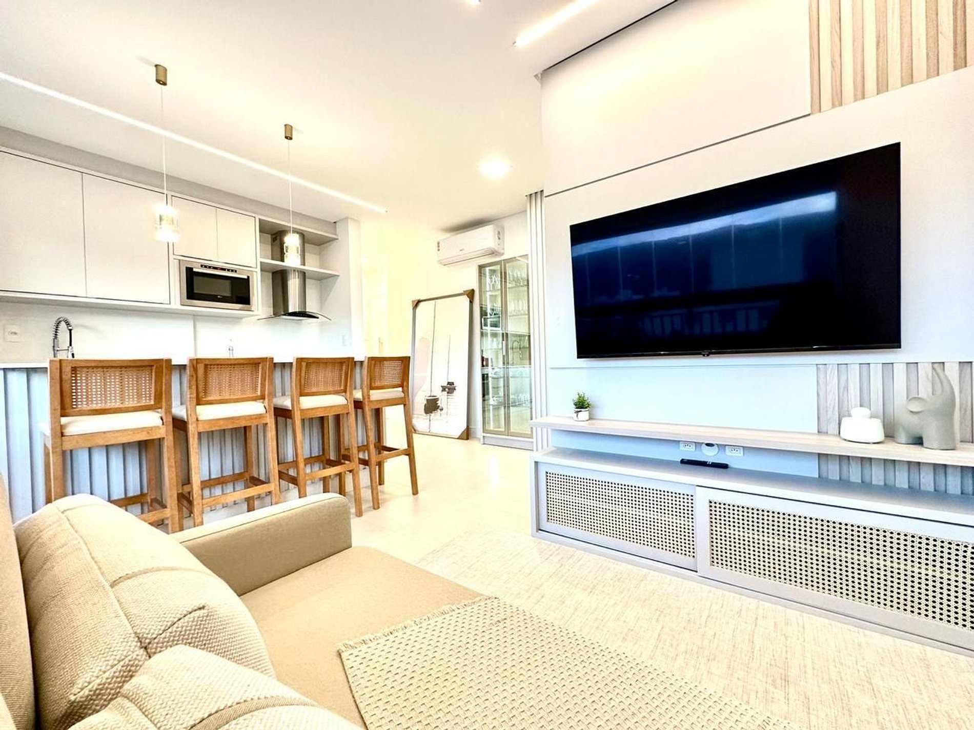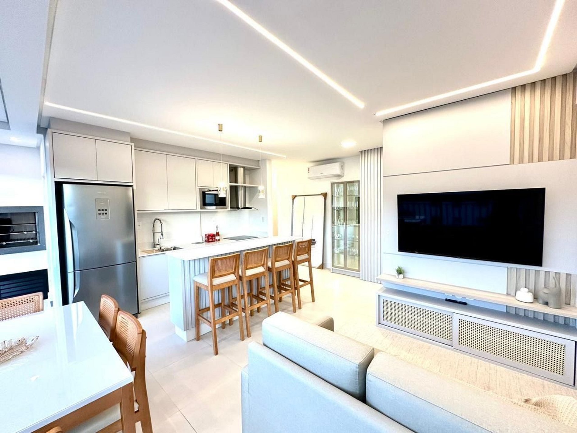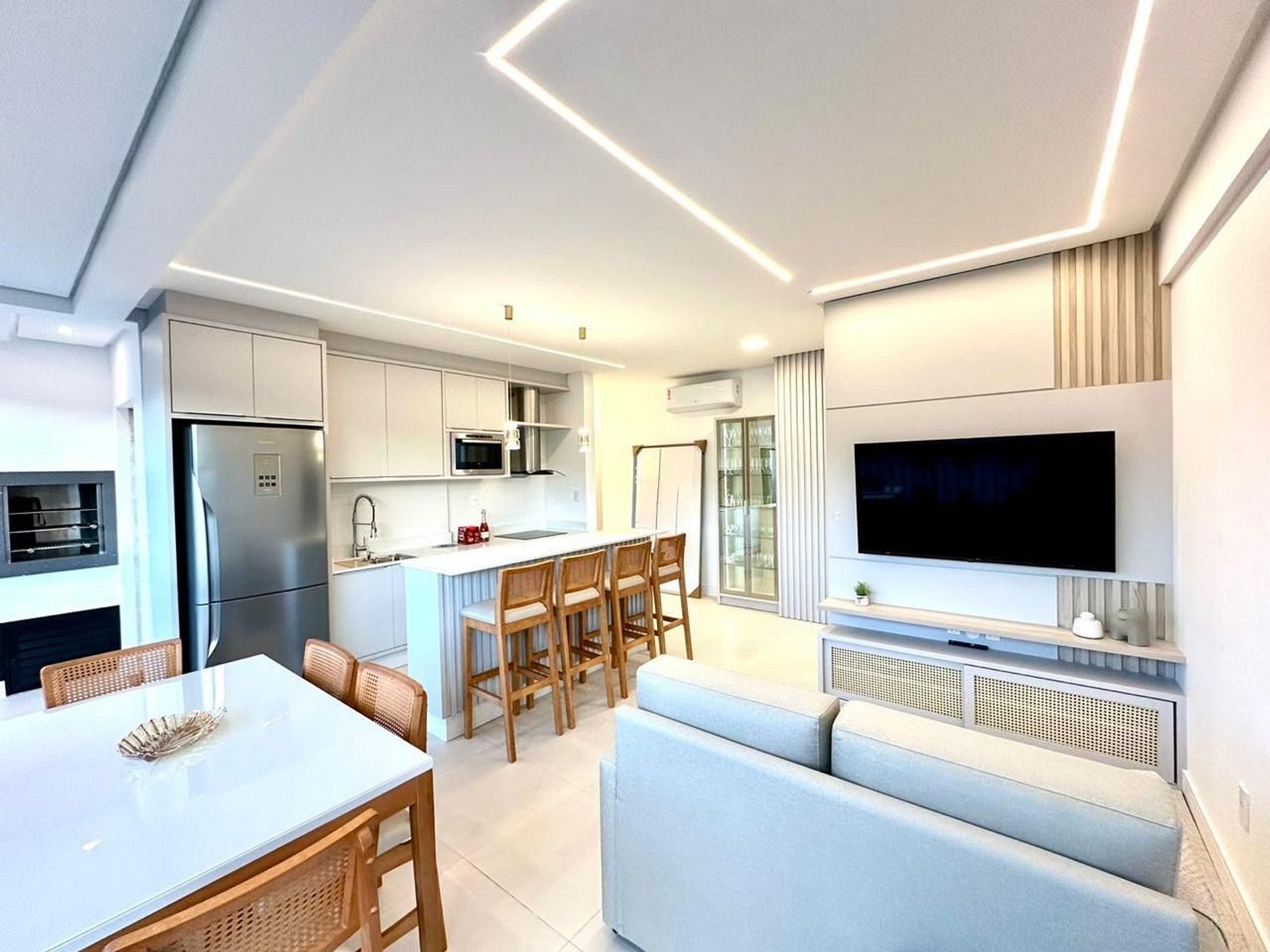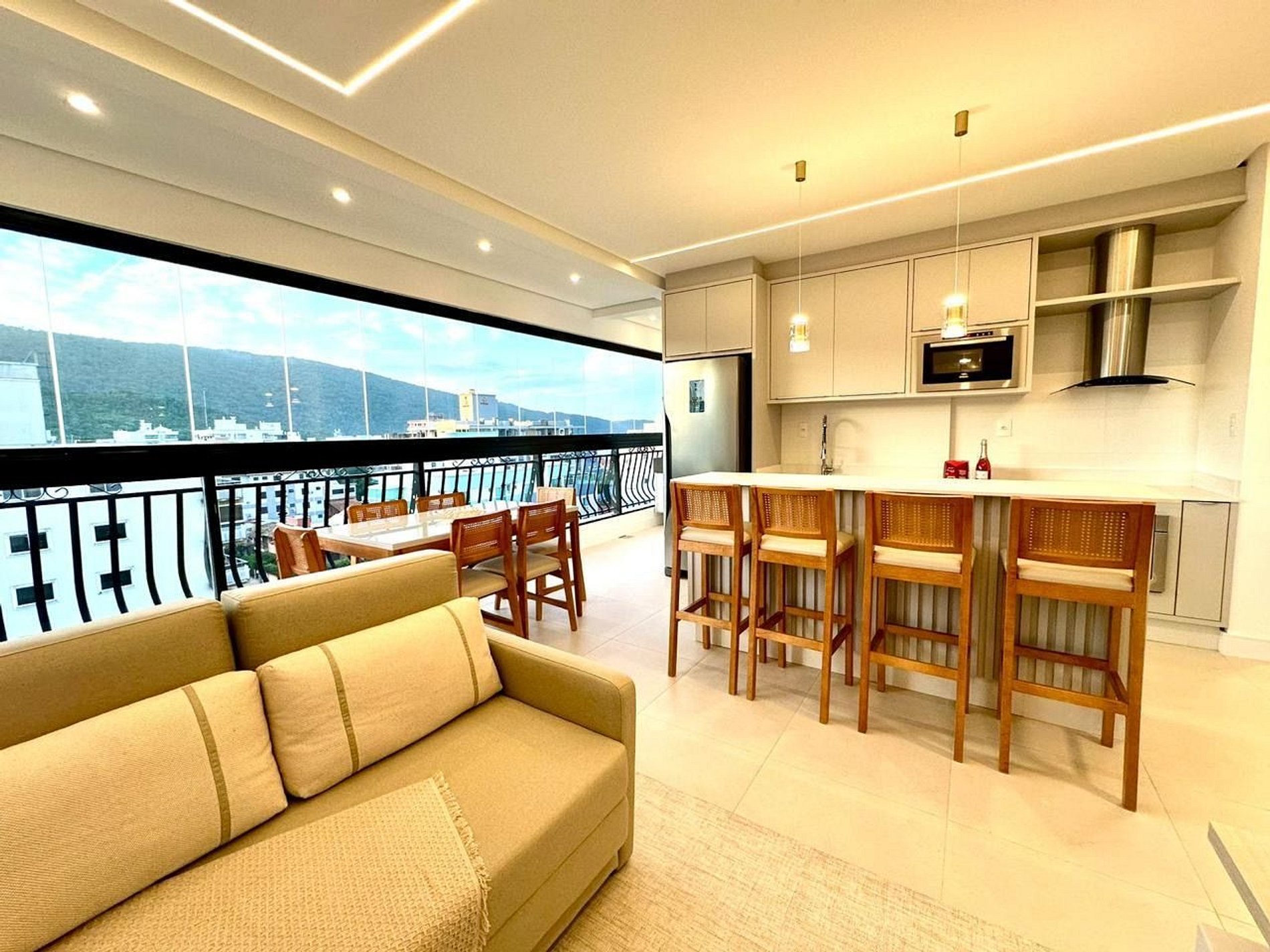 sala de estar e jantar integrados com vista para o mar;