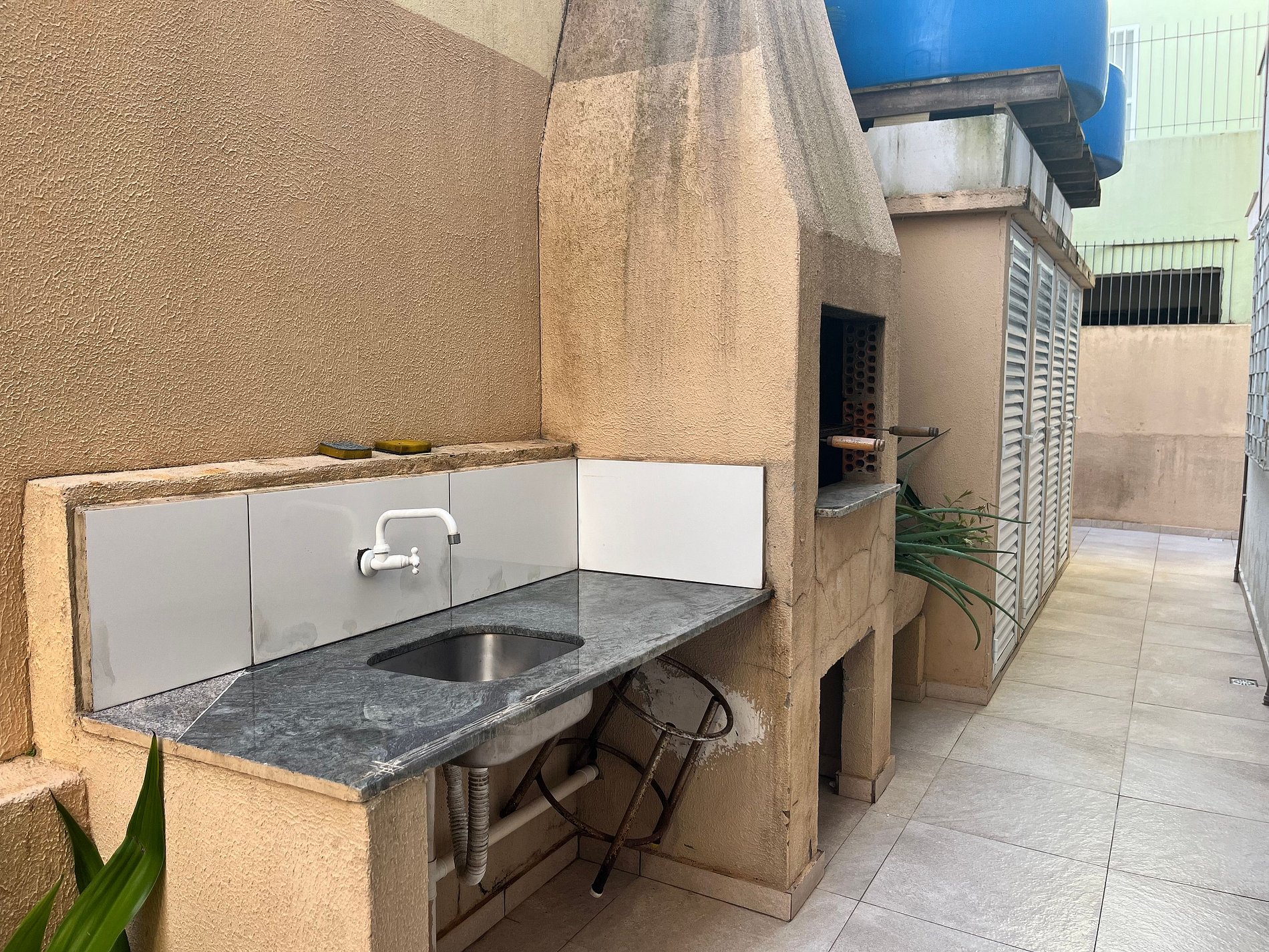 Espaço com churrasqueira equipado com grelha e espetos (COMPARTILHADO)